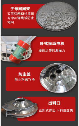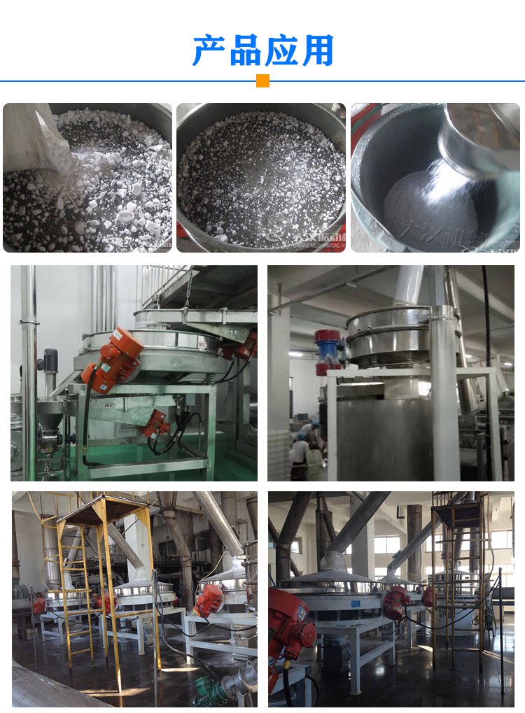 直排篩能夠進行簡單的安全篩分以及粉末或顆粒的分級,可用于:油漆、獸藥、面粉、肥料顆粒、鵝卵石、奧利奧粉、碳酸鋰、氫氧化鋰、染料、食品添加劑、硫化銨、石灰粉、砂、煤粉、塑料添加劑、調味品、鈉硫酸鹽、金屬粉、化工原料、淀粉、碳化硅、氧化鋅粉、膨化大豆、飼料添加劑、鈣粉、純堿。